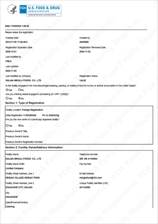 Dalian MingLu Foods CO.,LTD is specialized in aquatic products, agricultural and sideline products deep processing and freeze-dried products processing. The main products are Alaska Pollock, PC/AT Cod, Hake, Red fish/POP, Pink/Chum Salmon and Shellfish, Sea Cucumber. The products are mainly exported to the United States...
